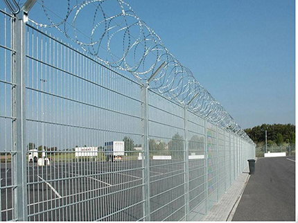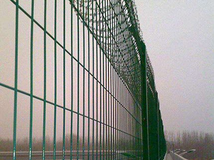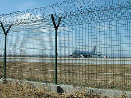 注:如果在機場隔離網(wǎng)頂部加裝刀片刺絲、刀片刺繩后又很好的增強了安全防護性能。采用電鍍、熱鍍、噴塑、浸塑等防腐形式,具有很好的抗老化、抗曬、耐候等特點。其產(chǎn)品造型美觀、花色多樣,既起到圍欄作用,又起到美化作用。由于具有安全性高、防攀爬能力好,網(wǎng)片連接方式采用特制SBS緊扣件,有效防止人為的破壞性拆卸,橫向四道折彎加強筋,使網(wǎng)面強度顯著增加。